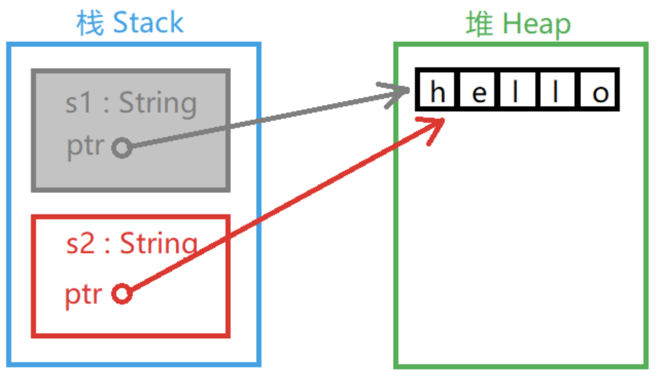 当变量超出范围时,Rust 自动调用释放资源函数并清理该变量的堆内存。但是 s1 和 s2 都被释放的话堆区中的 "hello" 被释放两次,这是不被系统允许的。为了确保安全,在给 s2 赋值时 s1 已经无效了。