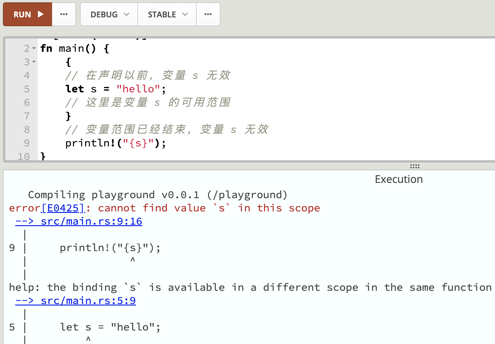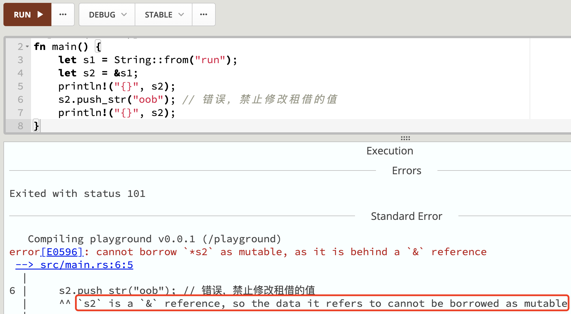 s2.push_str("oob"); // 错误,禁止修改租借的值