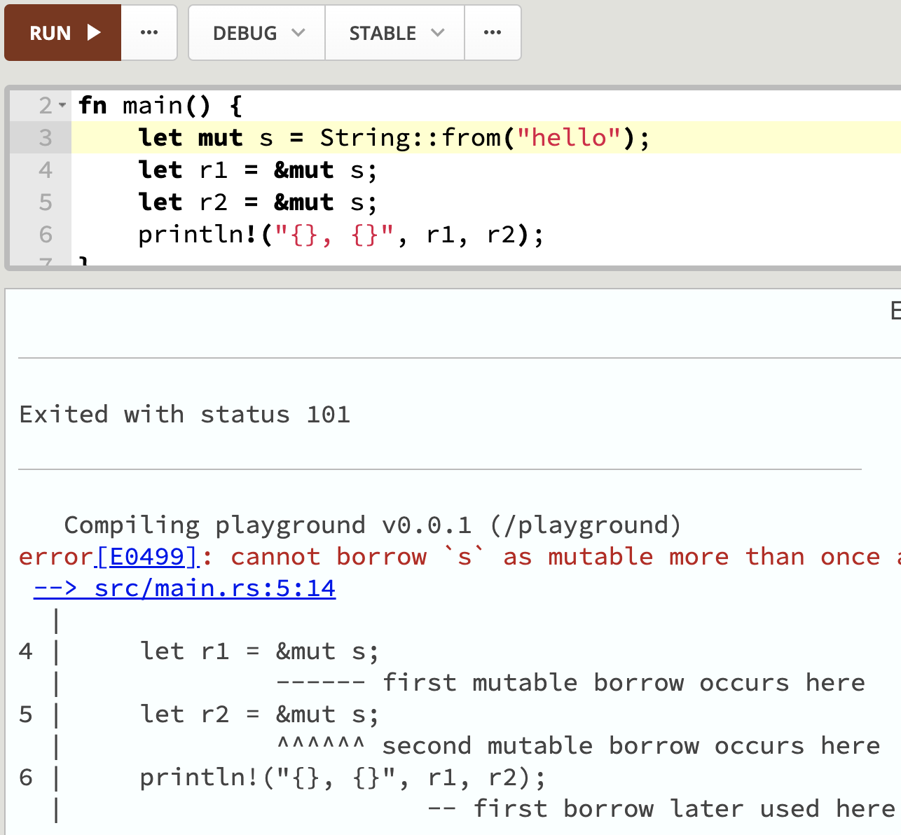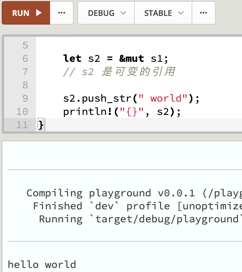 可变引用与不可变引用相比除了权限不同以外,可变引用不允许多重引用,但不可变引用可以: