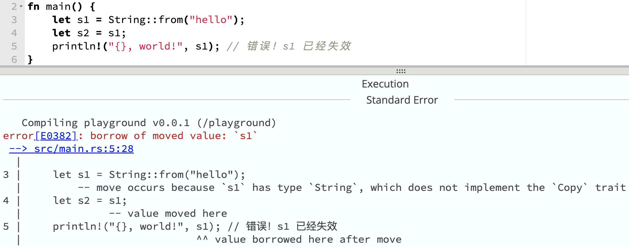 println!("{}, world!", s1); // 错误!s1 已经失效