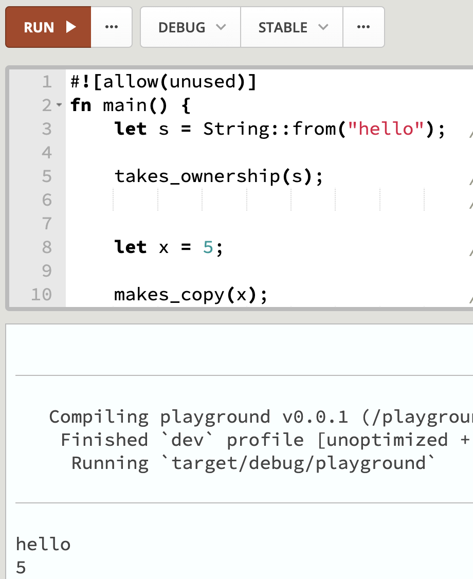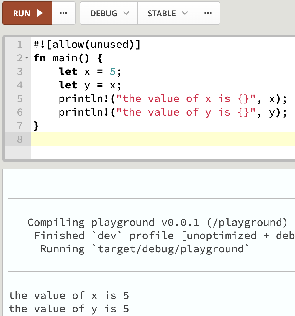 这个程序将值 5 绑定到变量 x,然后将 x 的值复制并赋值给变量 y。这是基础数据类型,且不需要存储到堆中,仅在栈中的数据的"移动"方式是直接复制。