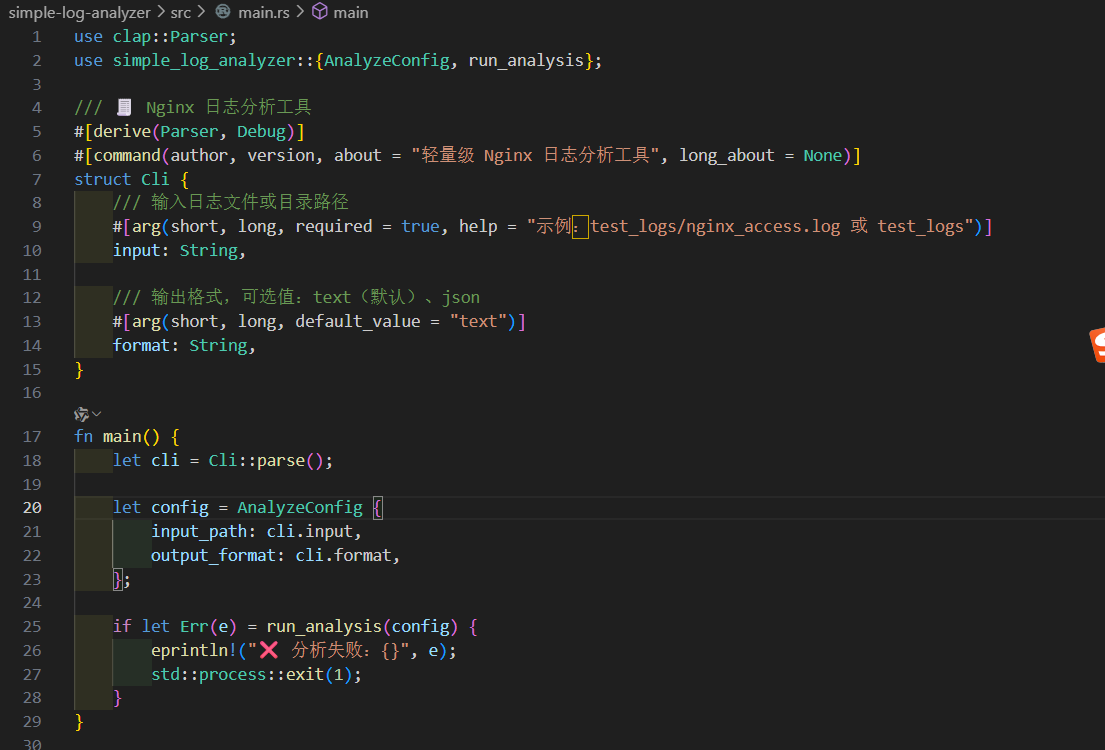 clap:命令行参数解析(简化指令处理);regex:日志行正则匹配(核心解析逻辑);chrono:时间提取与格式化(统计时间范围);serde + serde_json:JSON 输出(结构化数据);- 标准库