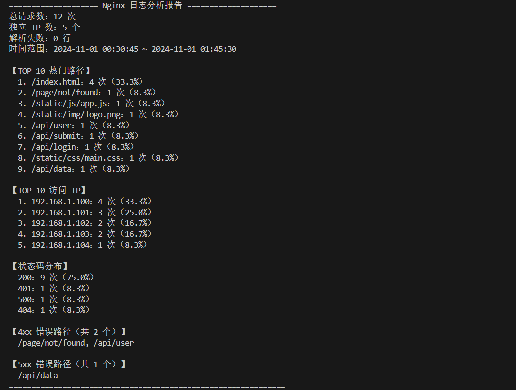 - 统计关键指标:总请求数、独立 IP、TOP10 路径 / IP、4xx/5xx 错误;