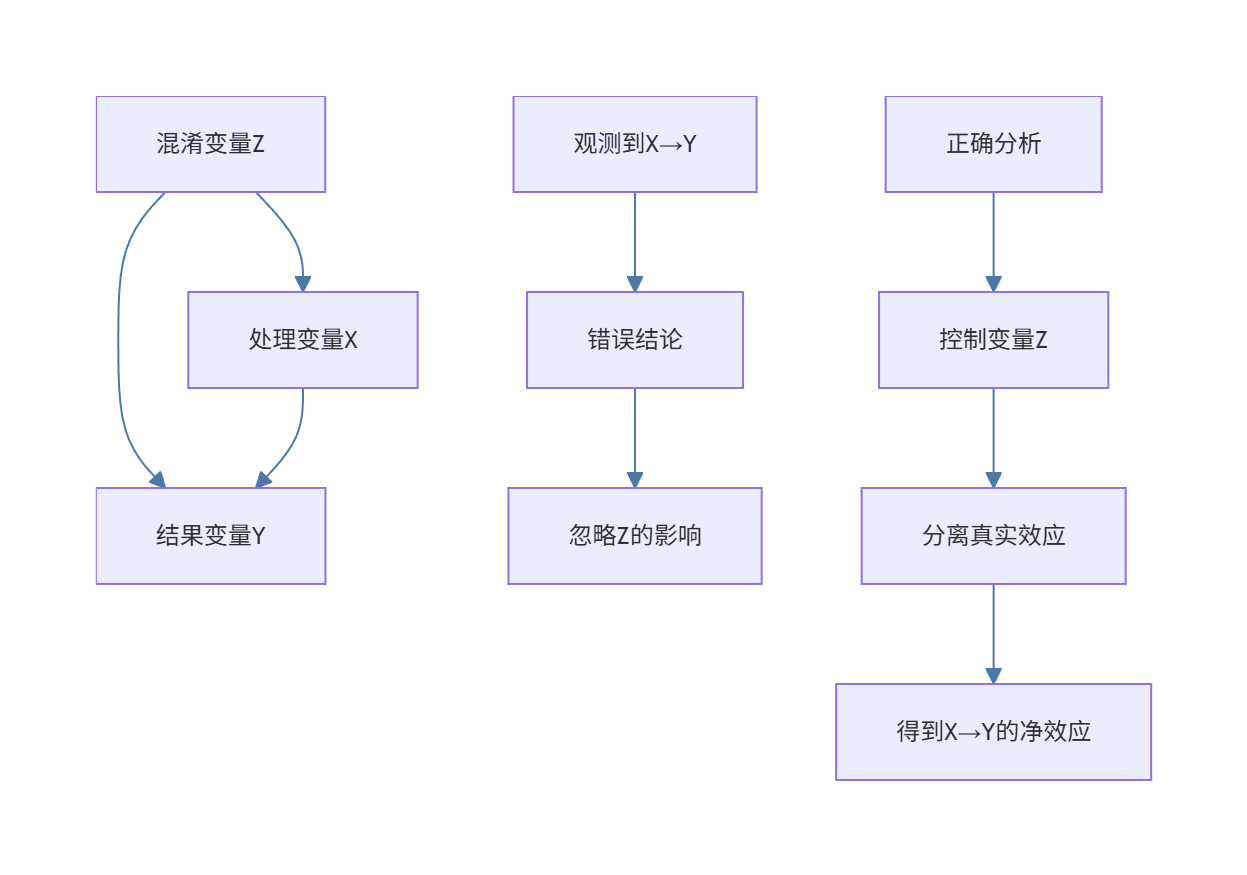 图4:混淆变量影响分析流程图 - flowchart类型,展示了混淆变量如何影响因果推断以及如何正确处理