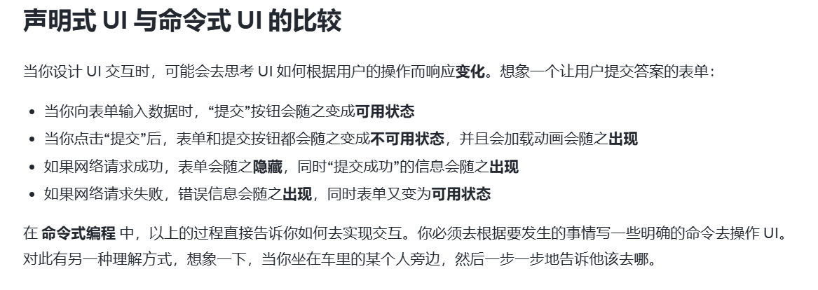 | 事件处理函数直接修改 UI | 事件处理函数只修改状态,UI 由状态自动驱动 |