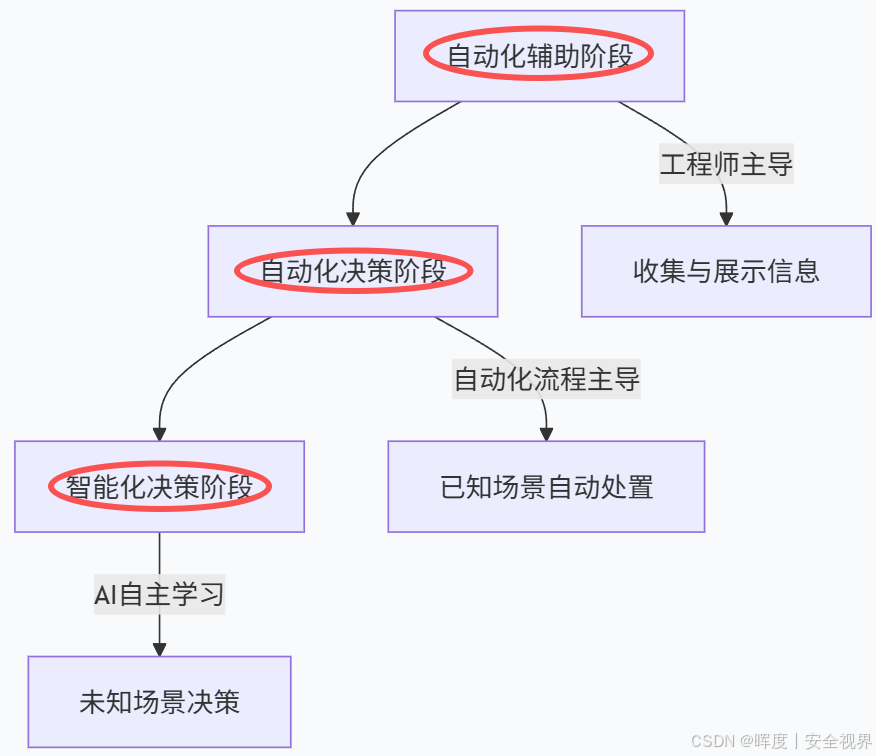 | 自动化决策阶段 | 自动化流程 | 已知场景自动处置,无需人工介入 | 安全工程师仅处理未知场景;例如SDL/DevSecOps自动化策略 |