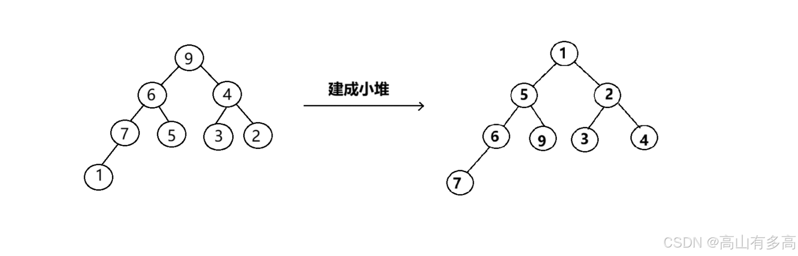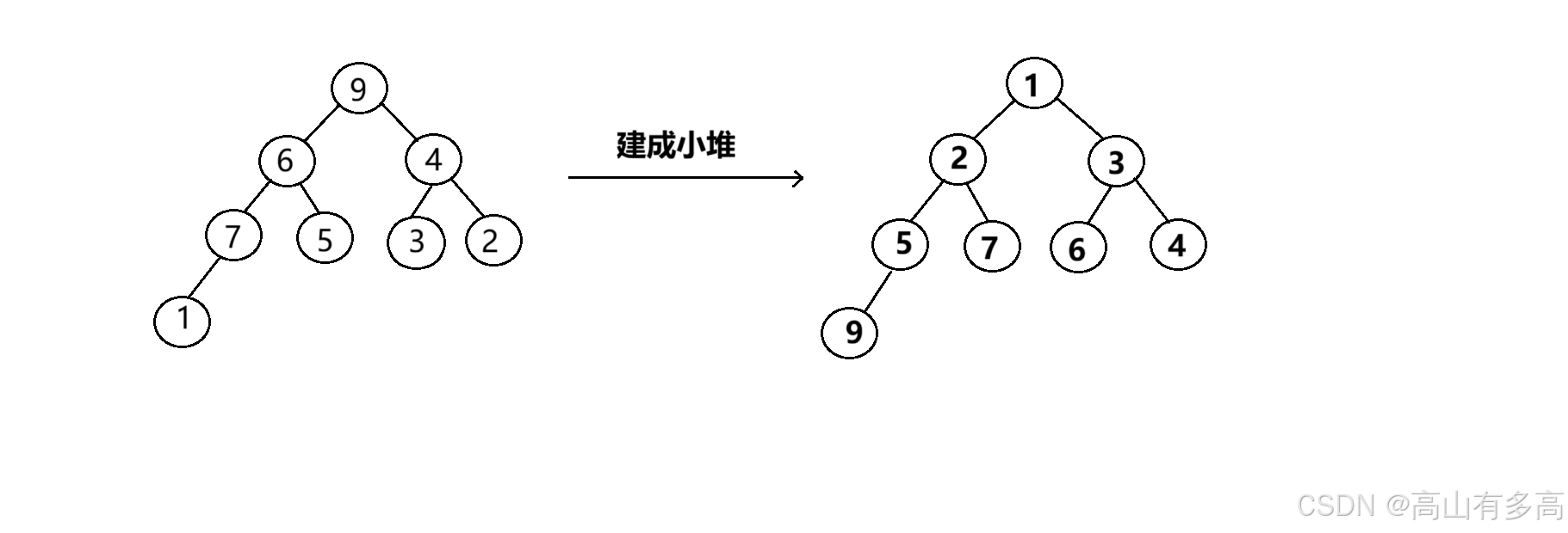 ③核心操作:建初始小堆 → 循环交换堆顶(最小值)与堆尾 → 调小堆」。