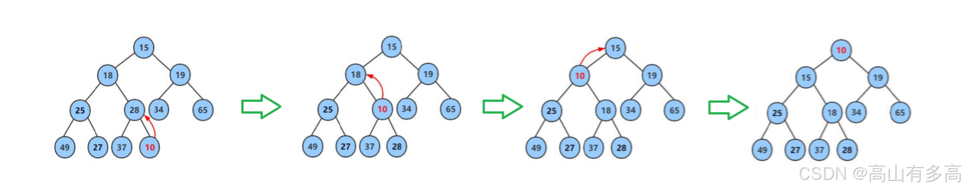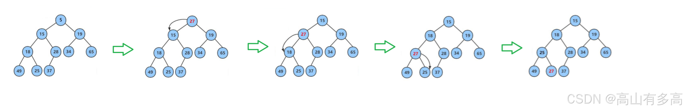 则现在的小堆变为:[27,15,19,18,28,34,65,49,25,37],此时堆中的元素不在满足小堆的特性,需要进行向下调整。