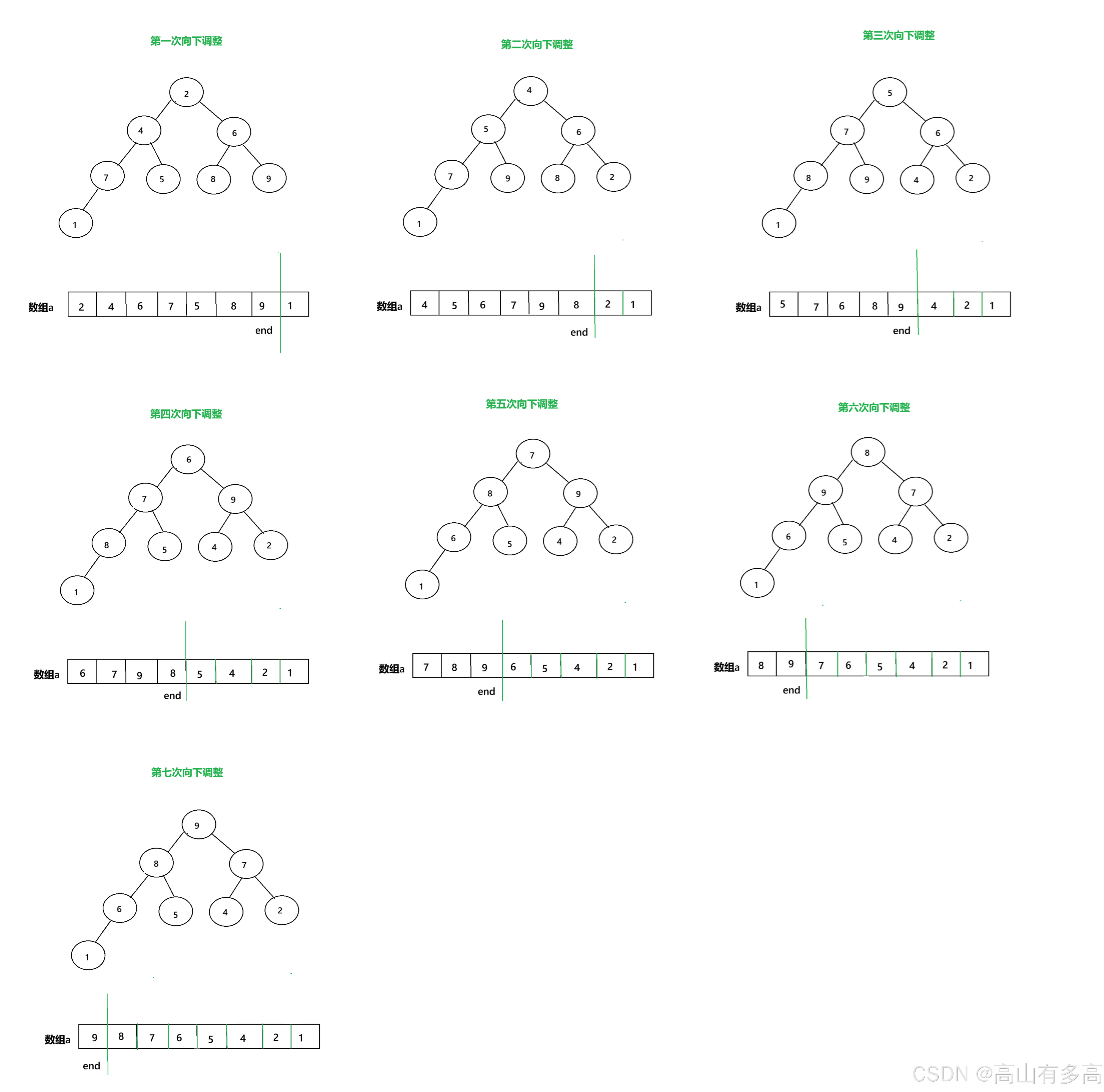 同理,若降序建小堆,通过将堆顶元素与堆尾元素进行交换后,然后不断进行调小堆,即可让堆中的最小元素放在堆尾,通过不断进行该操作即可让无序数组变成有序。