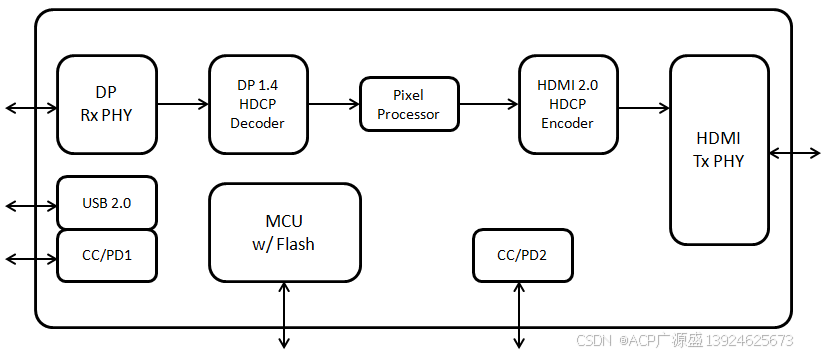 - 集成 RISC-V 增强型微控制器 和 嵌入式 Flash,支持固件在线升级和 EDID/HDCP 密钥动态配置,无需外部 MCU 即可实现完整的协议转换逻辑。