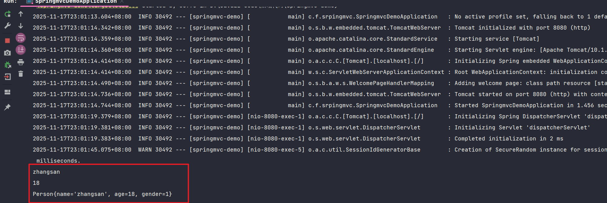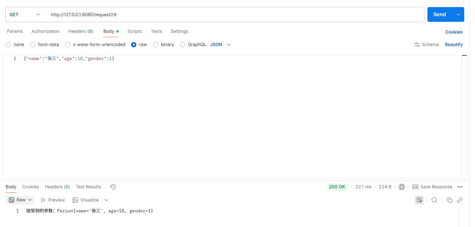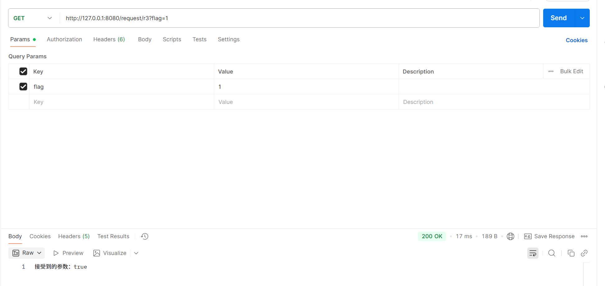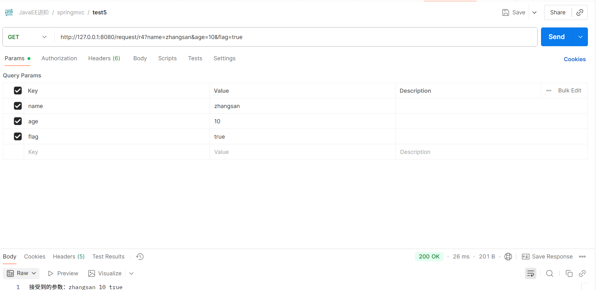 return "接受到的参数:" + name + " " + age + " " + flag;