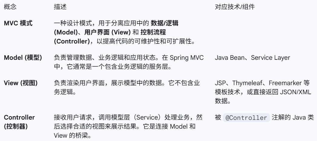 MVC 是一种架构设计模式,也是一种思想,而 Spring MVC 是对 MVC 思想的具体实现,除此之外,Spring MVC还是一个Web框架,总结来说,Spring MVC 是一个实现了 MVC 模式的 Web 框架