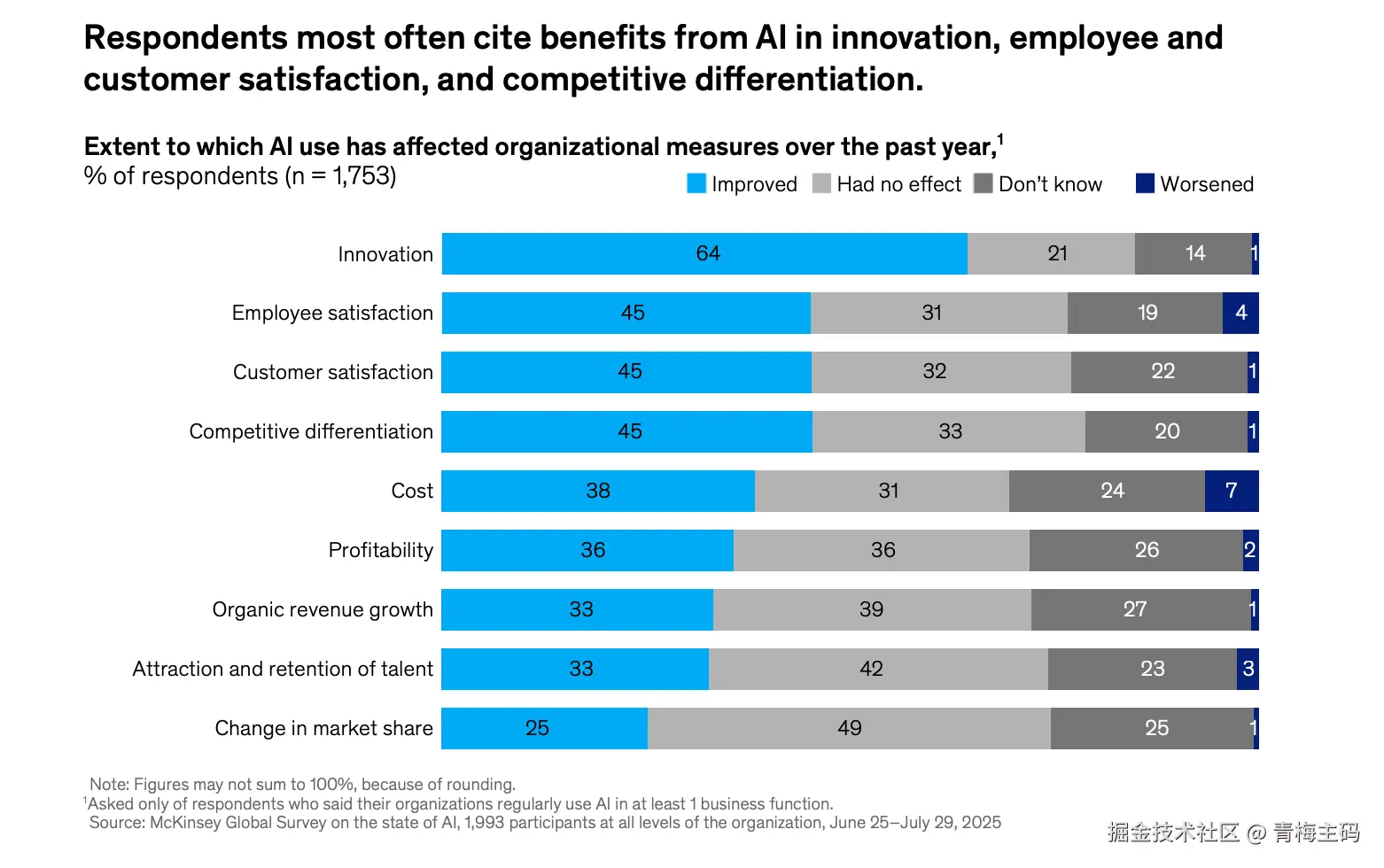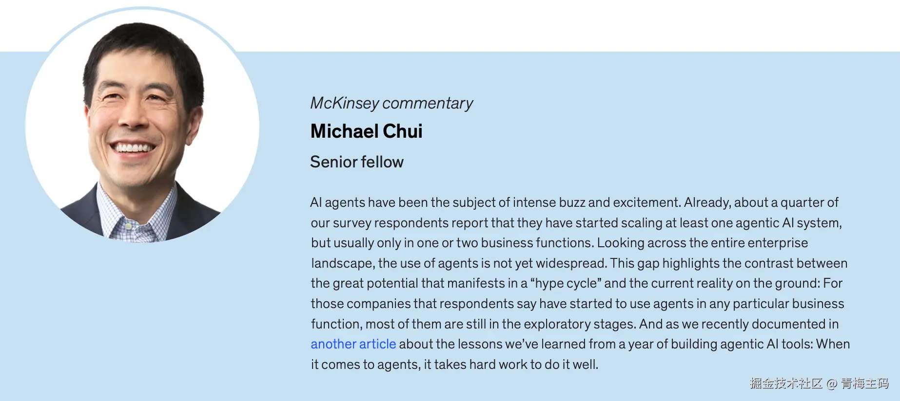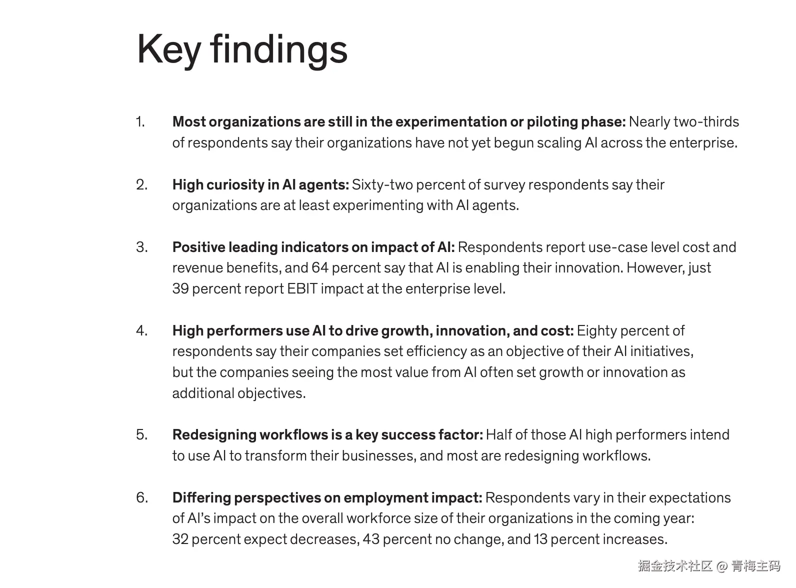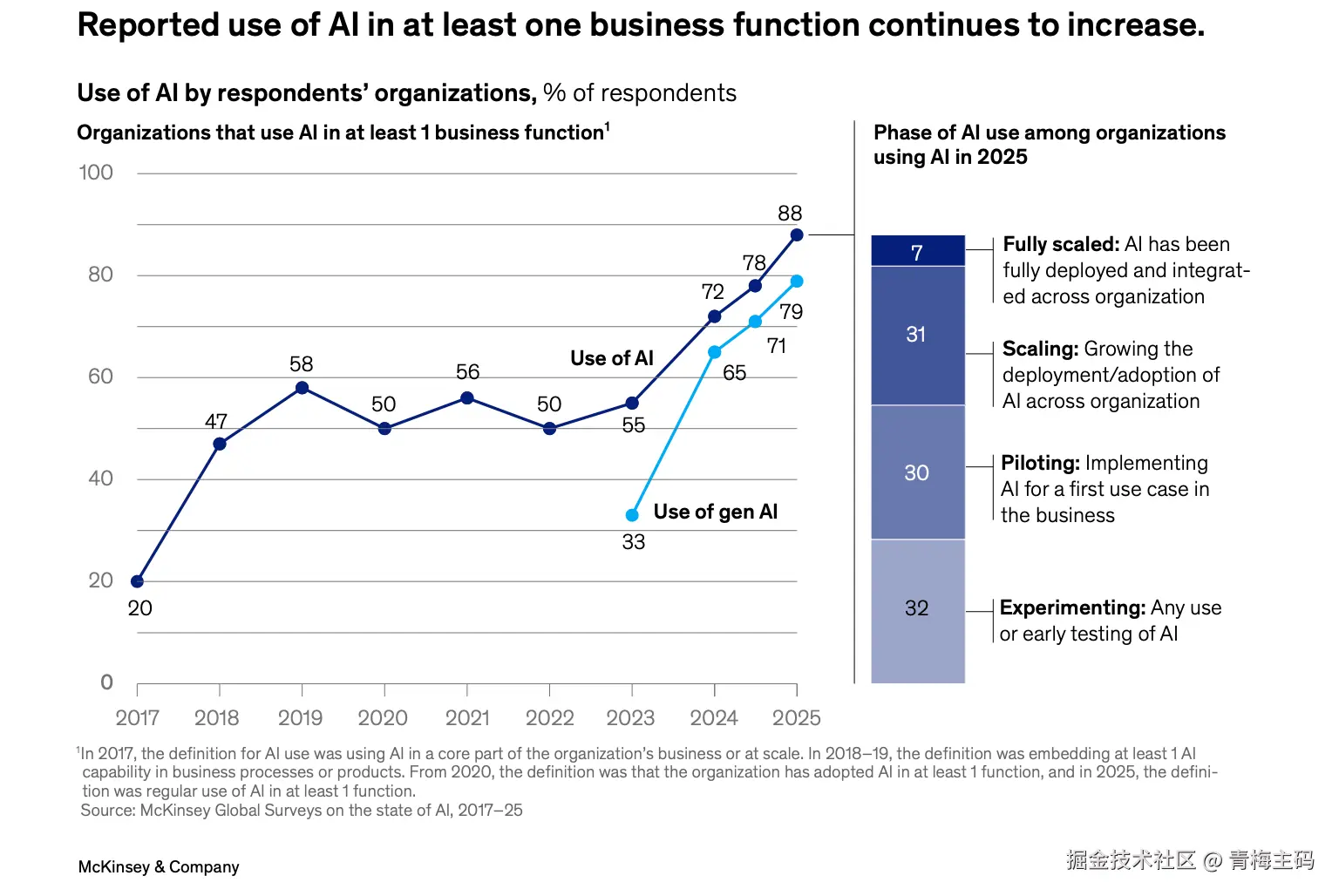 最近麦肯锡联合 QuantumBlack 发布了 2025年最新版《2025年人工智能的现状:智能体、创新和转型 》(《The State of AI in 2025:Agents, Innovation, and Transformation 》),这份报告基于全球近 2000 位企业高管和从业者的调研数据,真实反映了当下AI 在企业的落地情况。简单来说:几乎所有公司都在用 AI,但大多数还停留在"玩票"阶段。