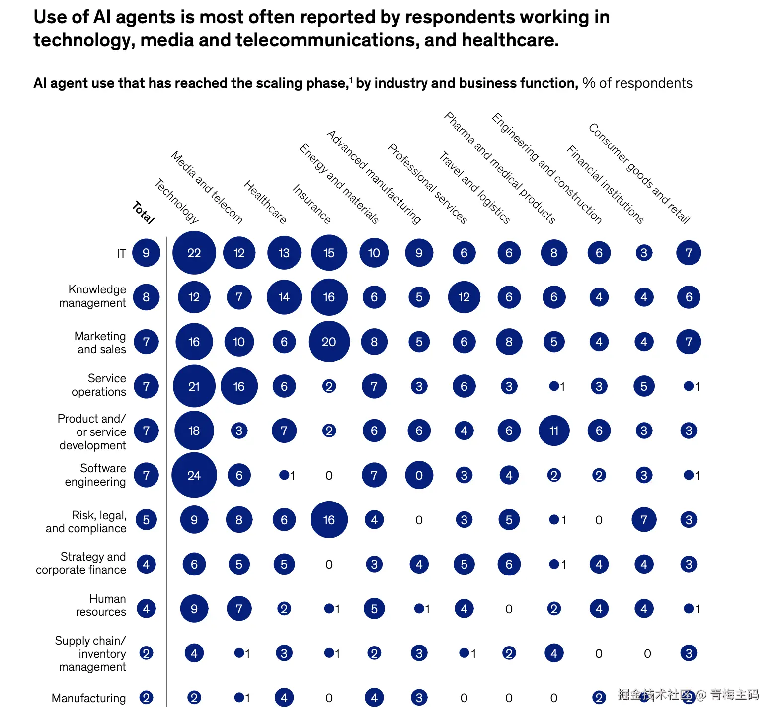 领先行业是:科技、媒体电信、医疗保健 ,这些行业的受访者报告 AI Agents 落地比例明显更高。