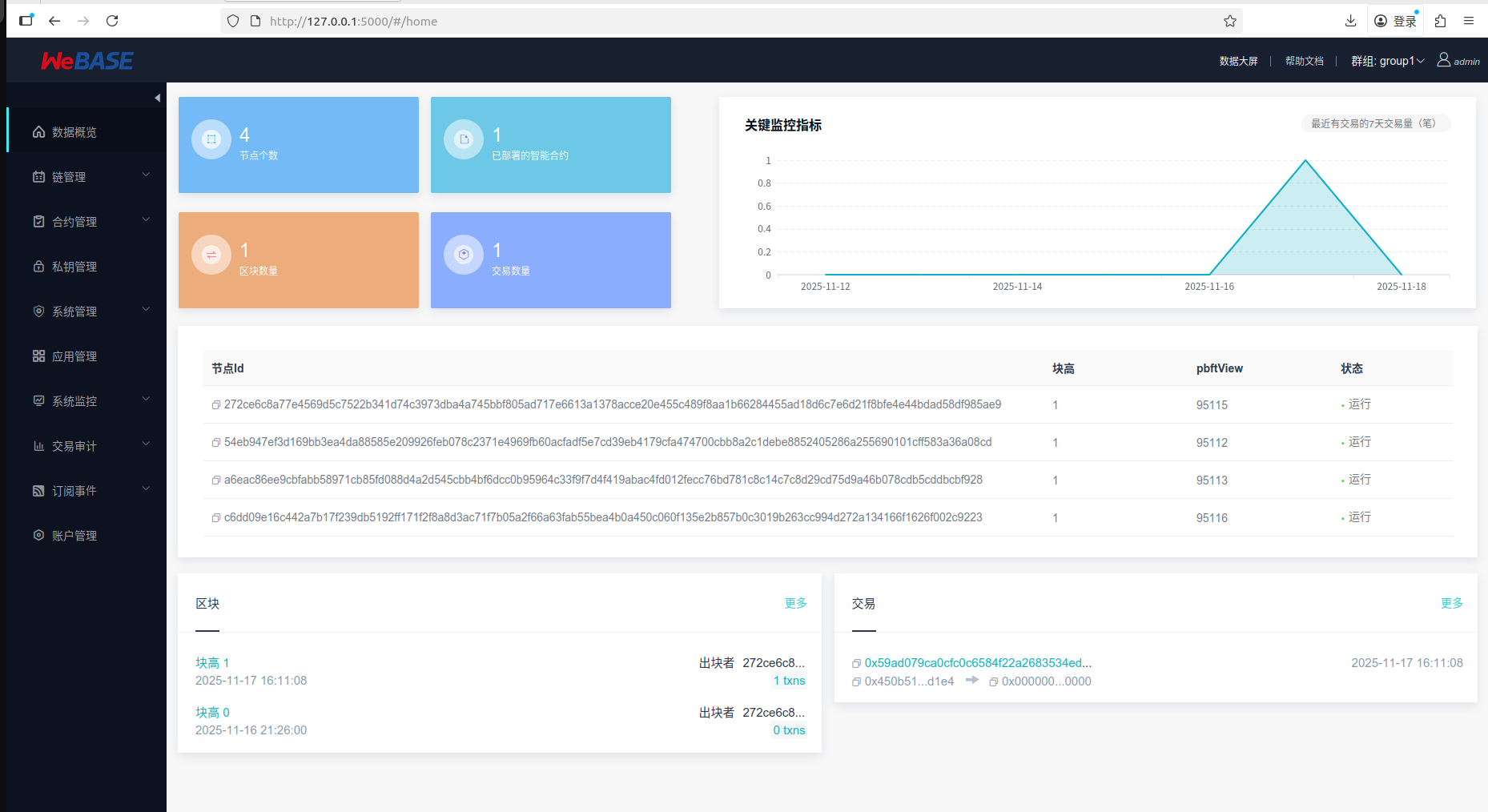 这里我就讲WeBASE-Web成功run起来了,但是还有一个小bug,就是合约管理页面的合约IDE页面打不开,这里后面再进行调试。
