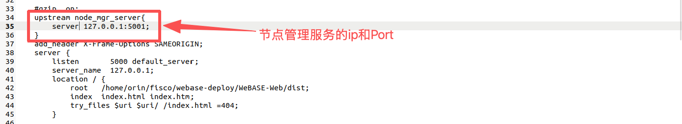 修改节点管理服务ip和端口:由于这里我是部署在本机,并且WeBASE-Node-Manager在部署的时候我也没有修改默认的5001端口
