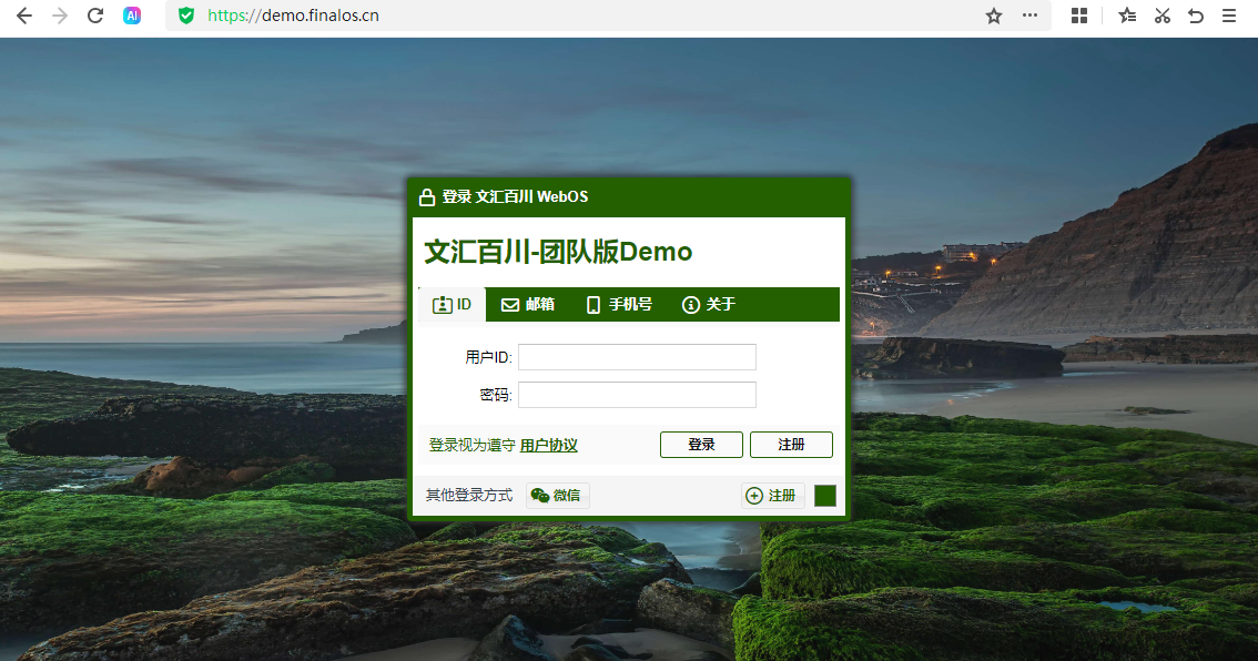 在文汇百川WebOS中,每个OS拥有独立域名(如demo.finalos.cn)、登录画面,支持配置壁纸和标语。用户首次使用需微信扫码注册。