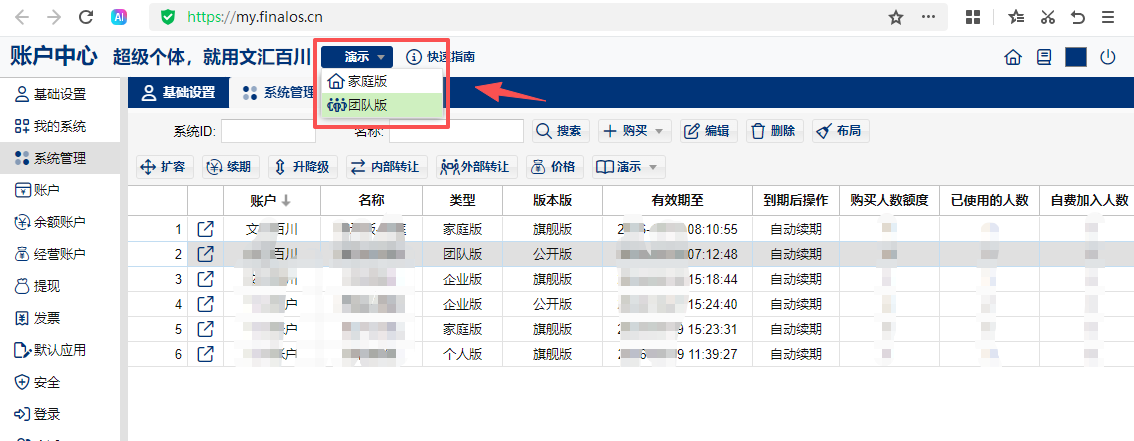 在账户中心(my.finalos.cn),可以点击上方的【演示环境】打开团队demo或者家庭demo。
