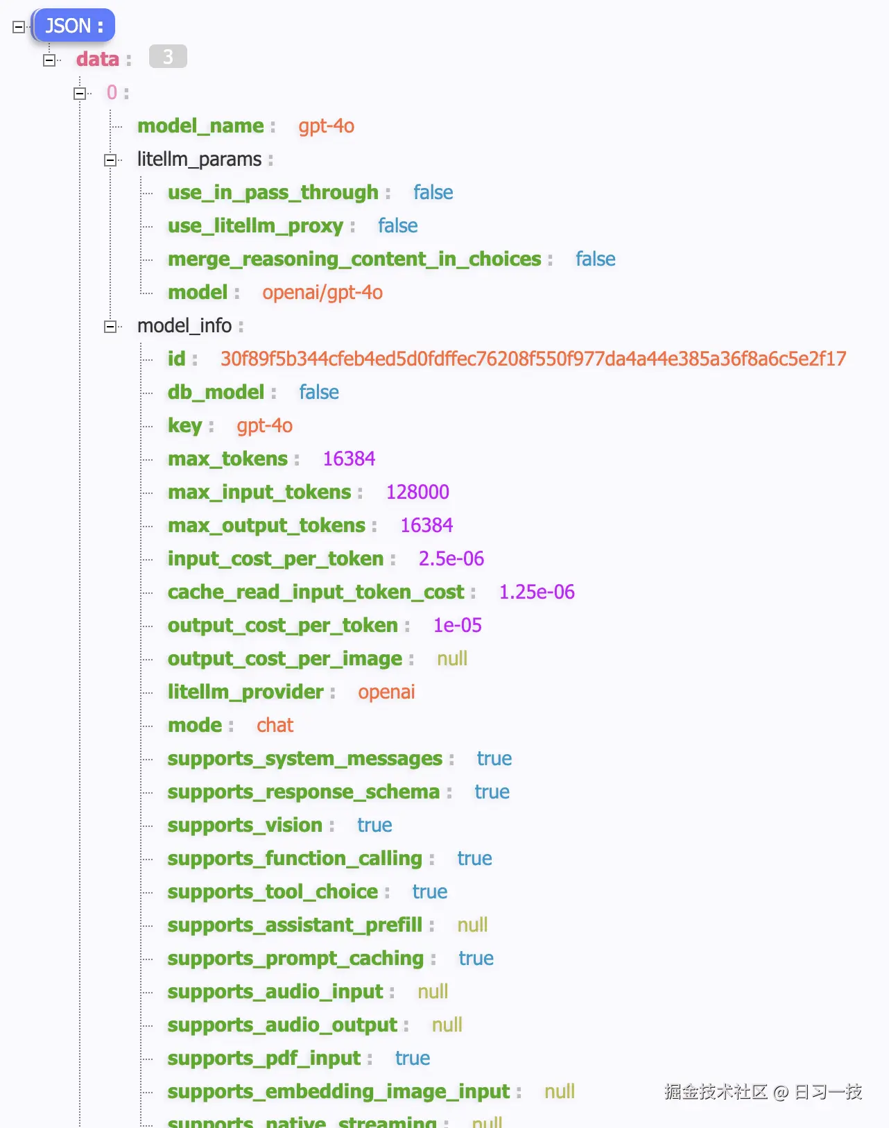 但在实际应用中,我们往往需要更多的信息。比如,某个模型的最大 Token 数是多少?调用这个模型的成本是多少?这个模型有什么特殊的功能限制吗?这就需要用到 model_info 字段,我们可以通过 /model/info 接口了解每个模型的详细信息: