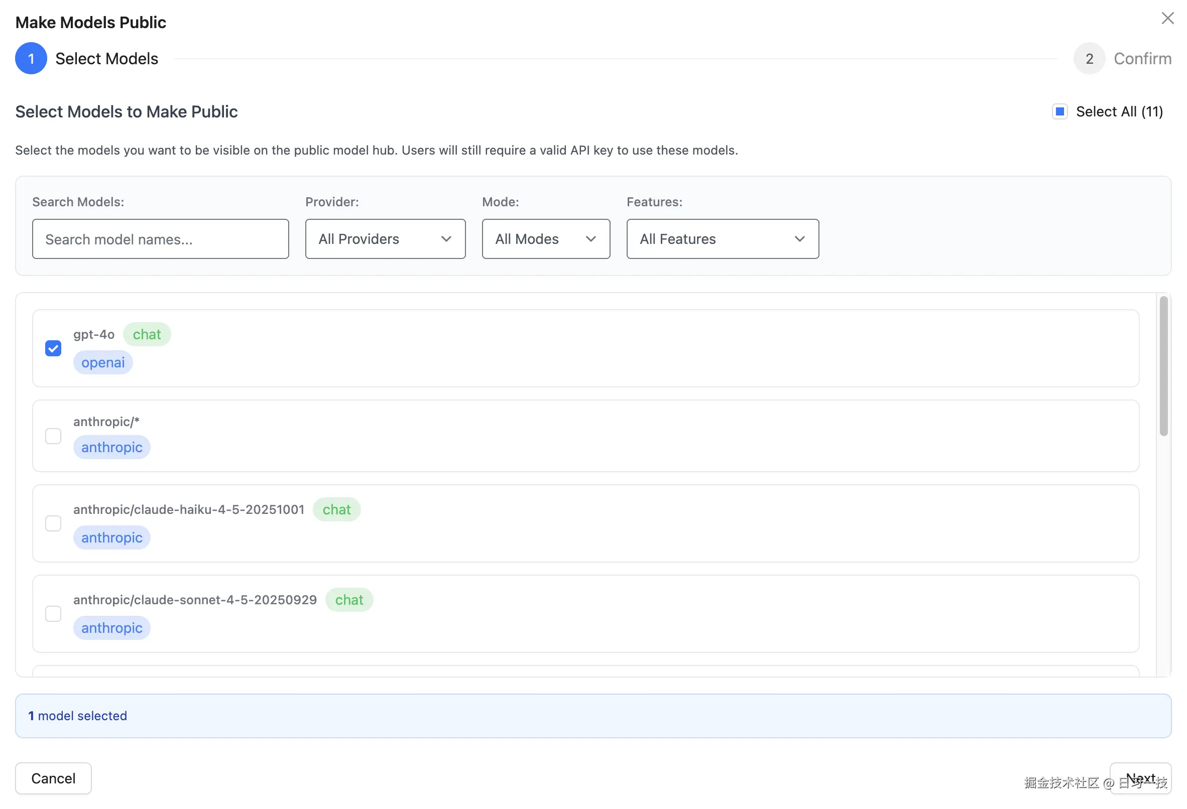 首先,我们需要在 Web UI 中选择要公开的模型。进入 Model Hub 页面后,点击 "Make Public" 按钮,选择要公开的模型: