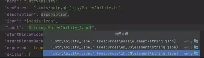 在上图中,icon 表示应用程序图标,label 表应用程序名称。本小节我们先来修改应用程序 名称。将鼠标放在$string:EntryAbility_label 上,然后按住 ctrl 按键,同时点击鼠标左键, 这时会弹出来三个 json 文件,因为 OpenHarmony 系统是中文的,所以点击最后一个文件,如 下图所示: