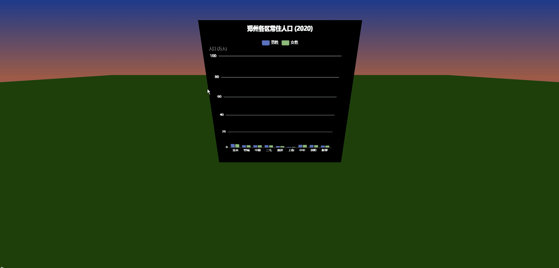 <title>Three.js 场景中的 ECharts 图表 - 郑州人口画像</title>