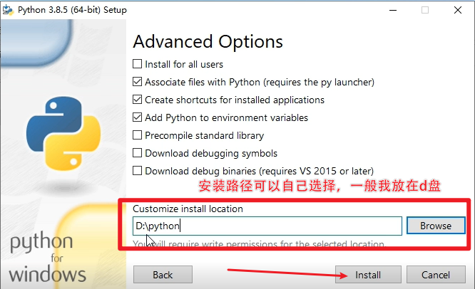 D:\Python,路径中不要有中文或空格),并勾选: