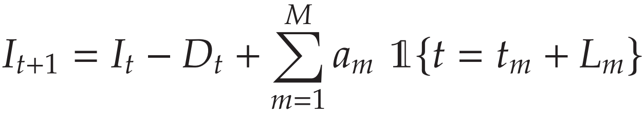 库存水平更新公式:下期初库存 = 本期初库存 - 本期需求 + 本期到达的所有订单数量。