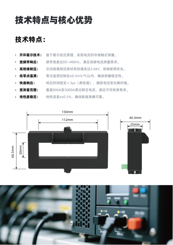 - 快速响应能力:响应时间≤3μs(典型值),频带宽度达 DC~40kHz,可精准捕捉 20kHz 电流谐波与瞬时变化,为系统控制提供实时数据支撑。