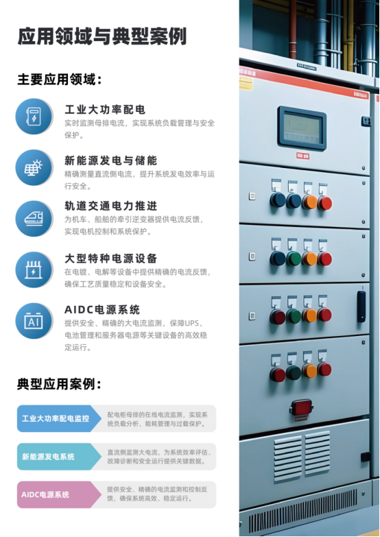 - 大型特种电源设备:在电镀、电解等设备中提供精确电流反馈,确保工艺质量稳定;为 AIDC 电源系统的 UPS、电池管理和服务器电源提供大电流监测,保障关键设备高效稳定运行。