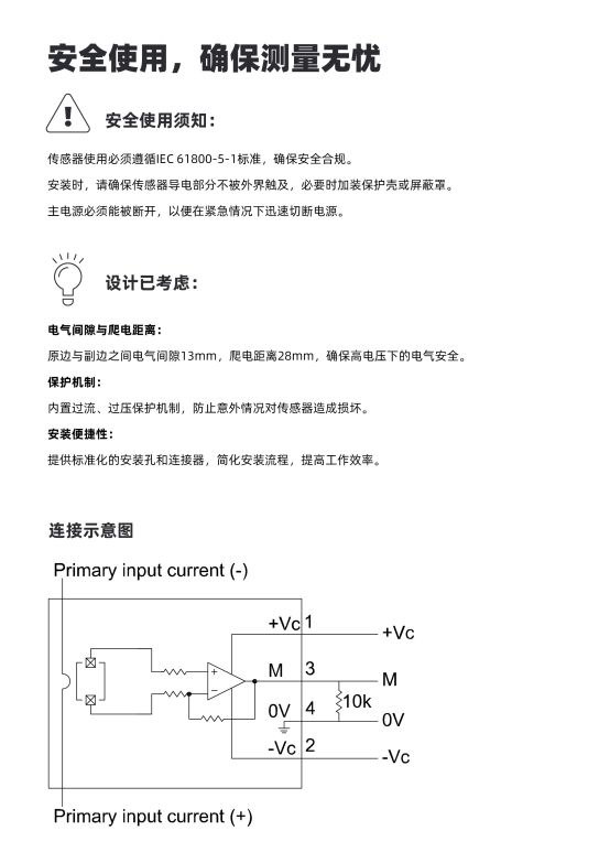 - 供电要求:需满足 ±15V 供电电压,确保传感器正常工作,避免电压波动影响测量精度。