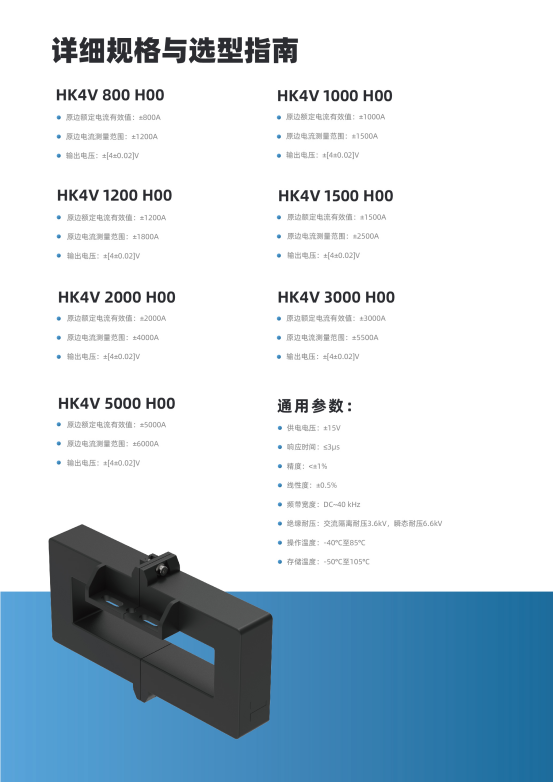 HK4V H00 系列隔离式开环霍尔电流传感器,以原生隔离架构、高绝缘耐压性能和精准测量能力,全面超越国际标准要求。其覆盖宽电流范围、适应恶劣环境、易于集成的特点,使其在新能源、工业、轨道交通等多个强电领域成为核心组件 ------ 既通过多重绝缘设计保障系统稳定运行与人员安全,又以高精度、快响应的测量能力为设备高效运维提供数据支撑。在强电应用场景日益复杂的今天,HK4V H00 以技术创新诠释了 "安全为本、精准为要" 的产品理念,为行业高质量发展注入动力。