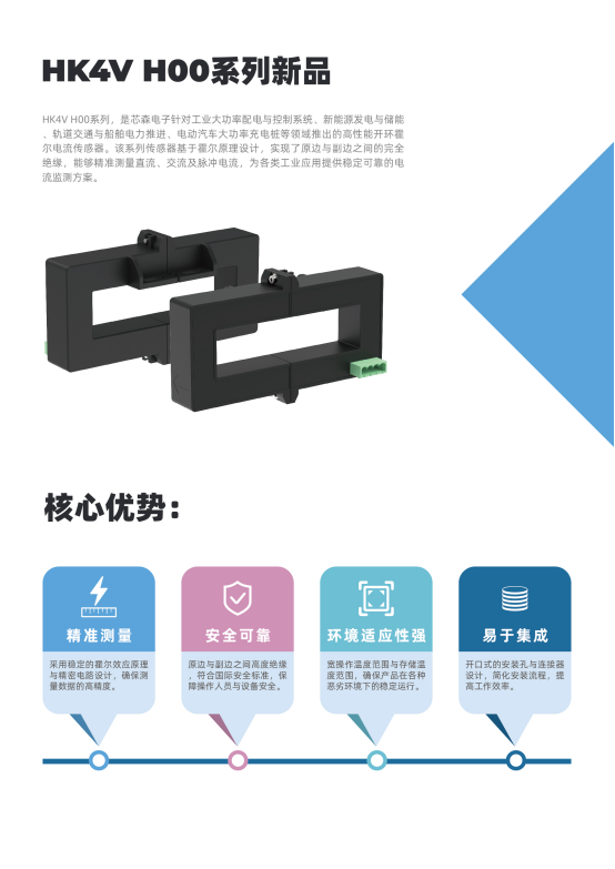 在工业自动化、新能源汽车、光伏储能、轨道交通等强电应用场景中,电流采样的安全性与精准性直接关系到系统稳定性和人员安全。传统非隔离采样方案因电气连接直接,易受共模电压干扰,甚至引发电弧放电或设备损毁。芯森电子推出的 HK4V H00 系列高性能开环霍尔电流传感器,通过原生隔离设计与高绝缘耐压特性的双重保障,可精准测量直流、交流及脉冲电流,为强电环境提供安全可靠的电流采样解决方案。本文将从隔离原理、核心性能、应用场景三方面解析其技术优势。