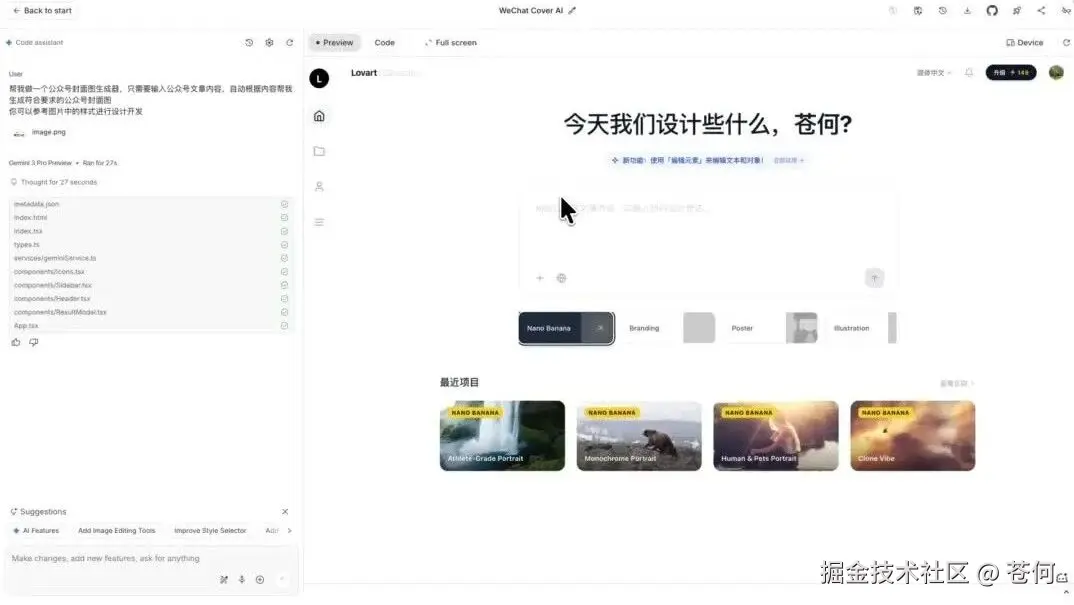 不仅仅是复刻网页,甚至还可以直接让他做个应用,比如我让他仿着 lovart 的风格来做个公众号封面图生成器。
