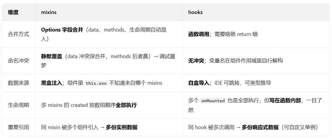 data 是深合并,methods 是覆盖,hooks(生命周期)是队列,记忆成本高。