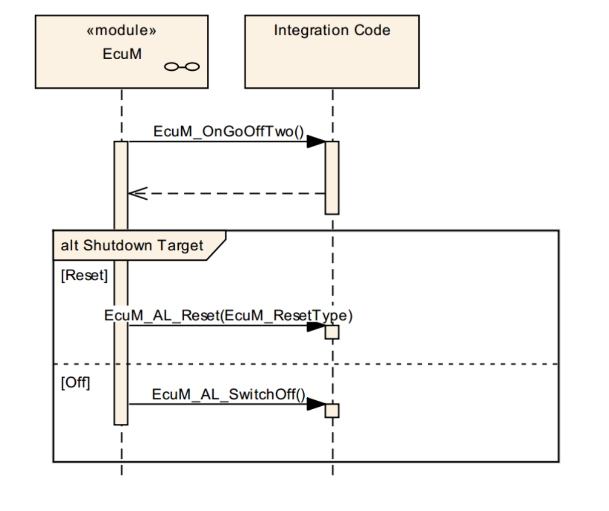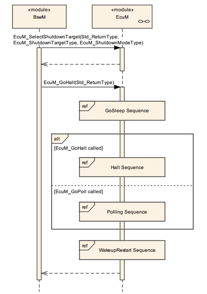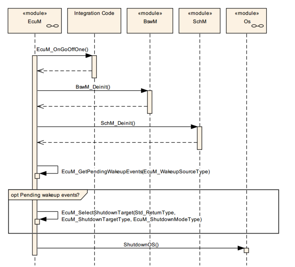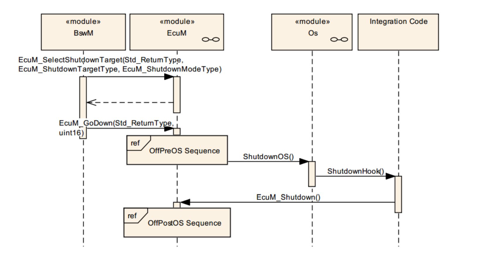 由BSWM先发起,调用ECUM接口,也是按照顺序调用下面几个序列。关闭OS和ECUM,执行OS下电钩子函数。
