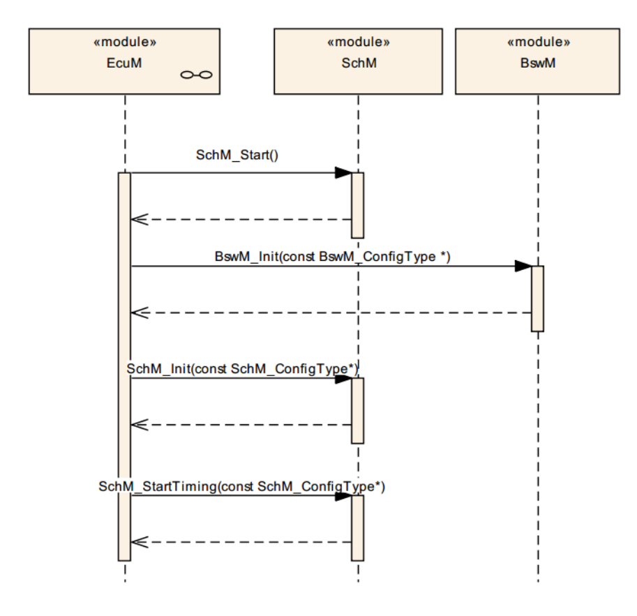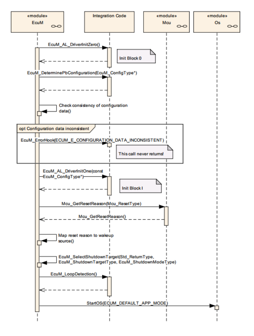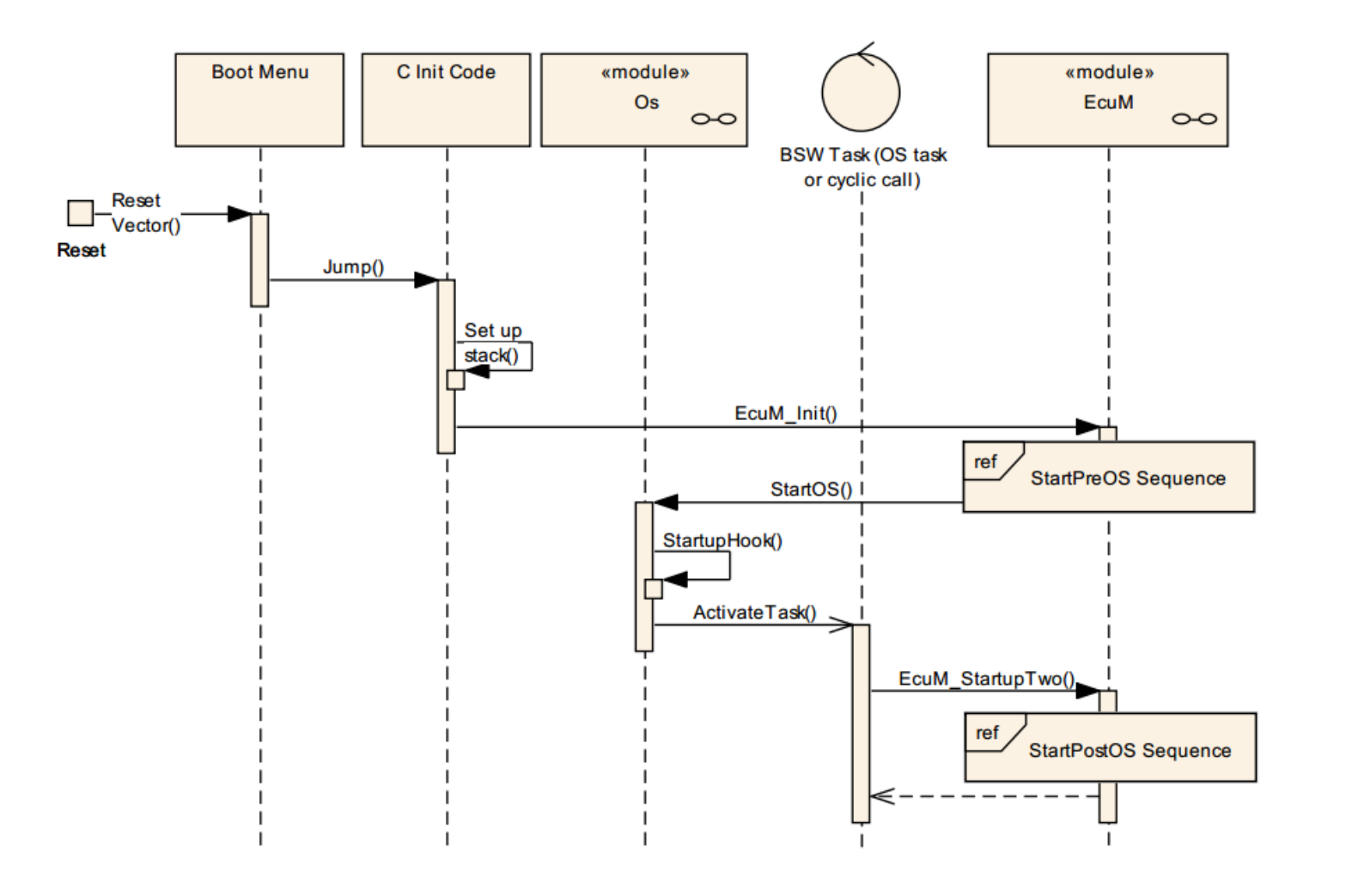 执行StartOS之后的启动序列,ECUM按照顺序调用下面四个接口。初始化BswM之后,从EcuM的角度来看,启动序列结束,因此必须使用BswM设置所有额外的启动步骤,譬如NvM_ReadAll,Rte_Start......