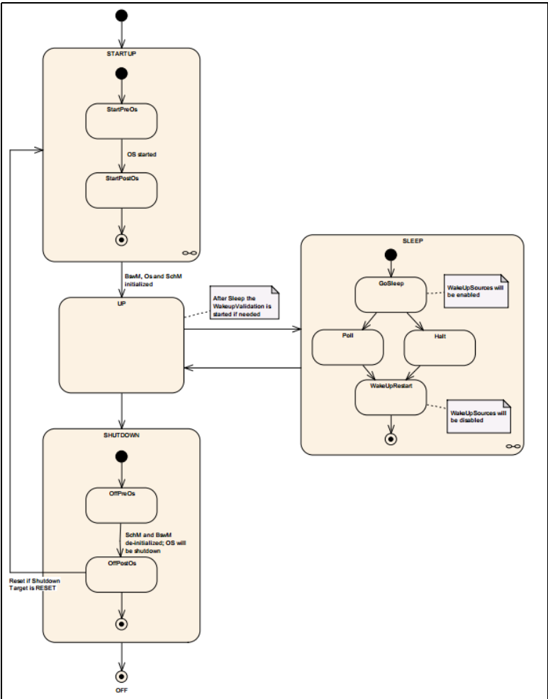 4、下电的时候执行下电流程,跳转到shutdown状态,执行OffPreOs动作调用ShutdownOS函数,将各个模块进行逆初始化。然后执行OffPostOS动作,将OS shutdown。
