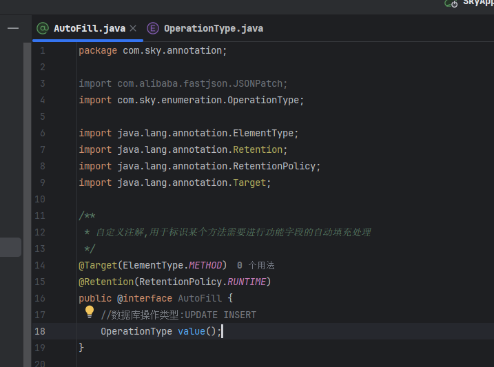 自定义注解AutoFill,用于标识需要需要进行公共字段填充的方法