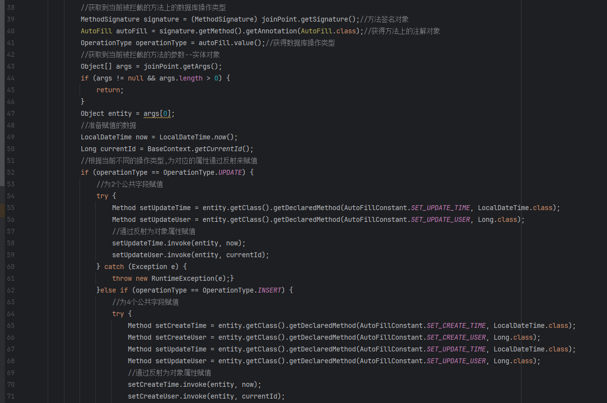 自定义切面AutoFillAspect,统一拦截加入了AutoFill注解的方法, 通过反射为公共字段赋值