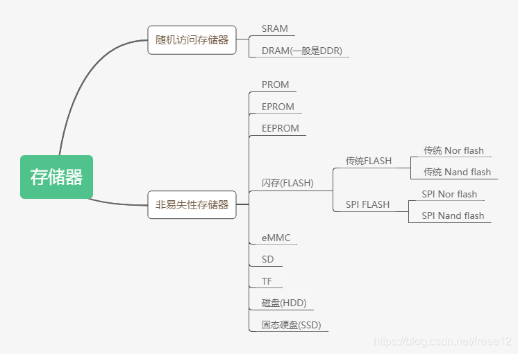掉电后数据长期保留,核心类型包括 ROM、Flash、机械硬盘、光盘等,其中 Flash 是嵌入式系统的主流选择: