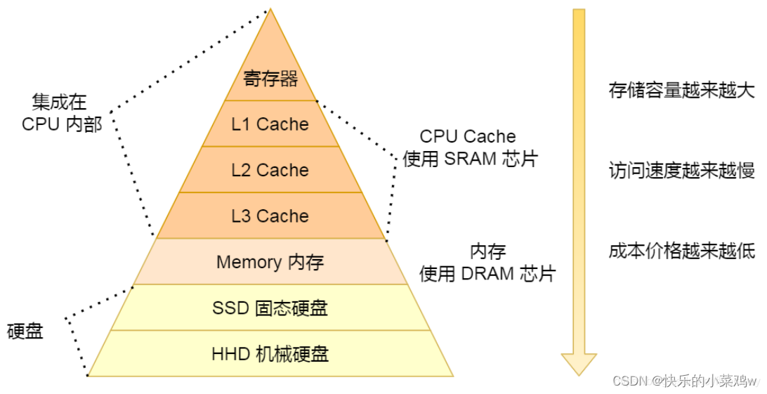 - 缓存(Cache):速度最快、容量最小,用于缓存 CPU 频繁访问的指令和数据,减少主存访问延迟。