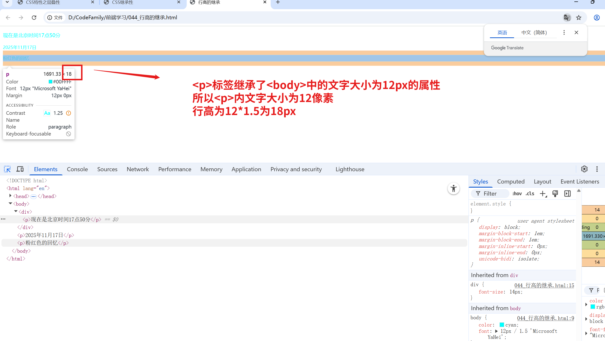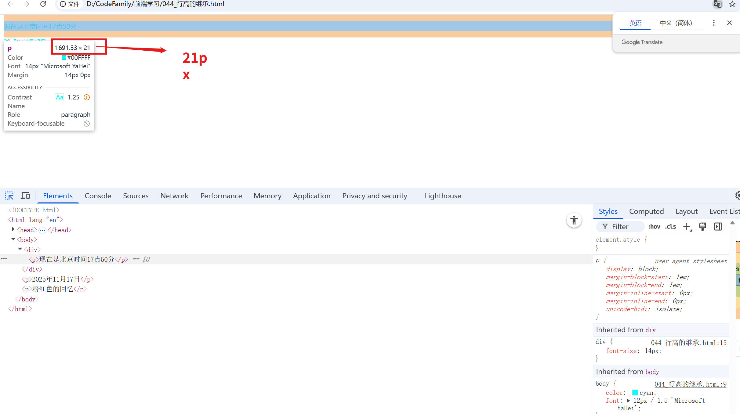 修改正确后,可以发现确实<p>中的字体的字体大小继承了当前行高*1.5这个属性