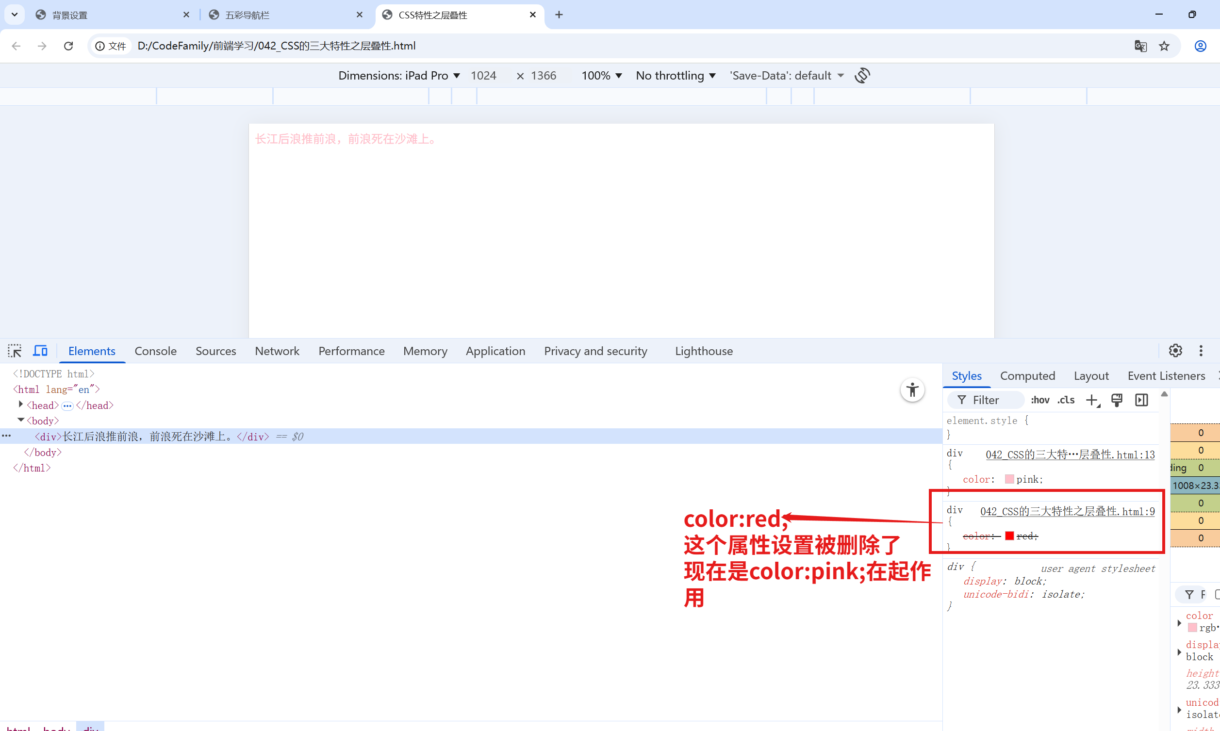 则最优先设置pink颜色(注意:!important单独写才起着权重最大的作用,如果它写在其他选择器内部,那么它就是属于这个选择器的权重,遇到比这个选择器权重大的选择器,那么CSS就会执行那个权重更大的选择器中设置的属性)