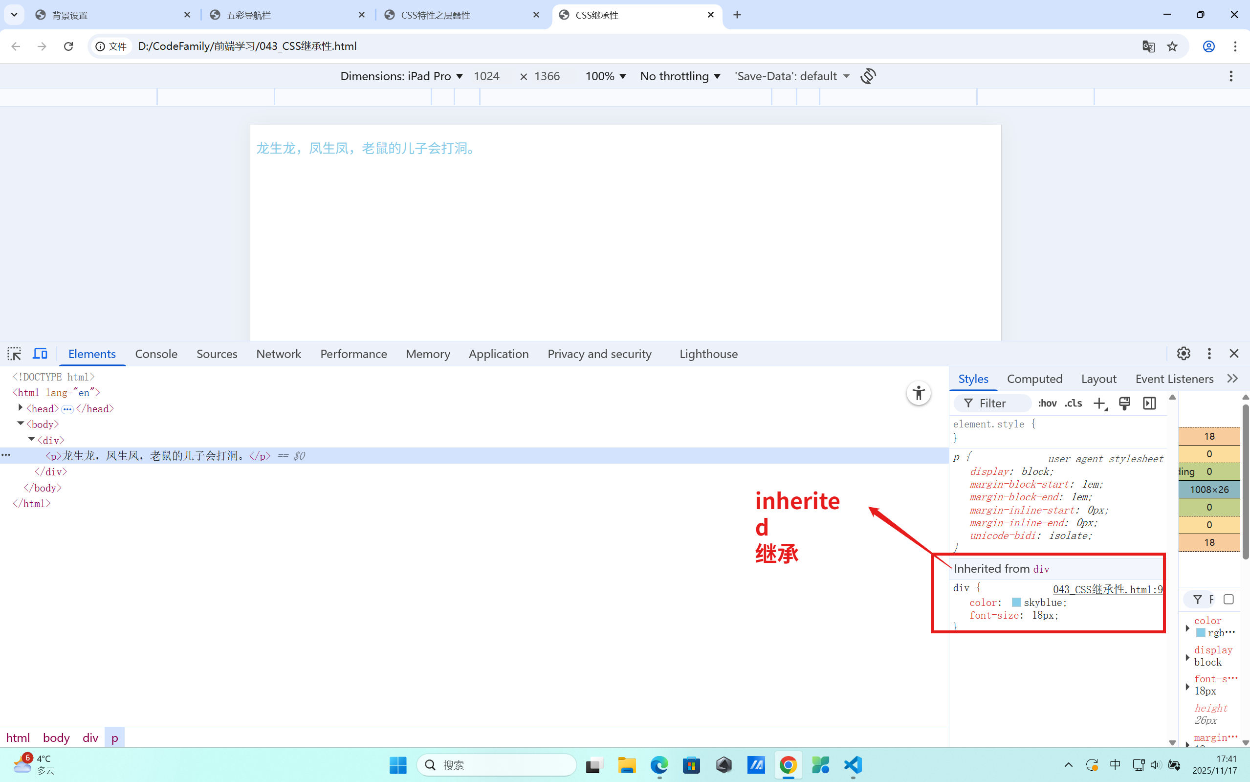 效果:可见,虽然没有给<p>标签设置样式,但是由于它在<div>标签内部,是<div>标签的子节点,所以会继承<div>标签的样式