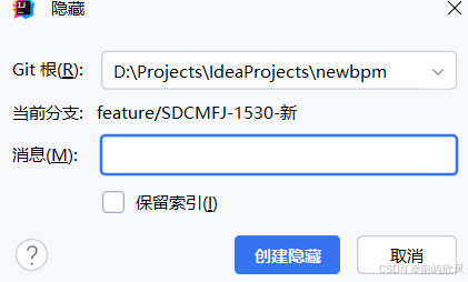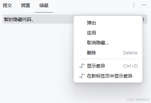 在Git Stach的时候填写消息备注好此次隐藏的主题,然后即可切换到别的分支。当别的分支任务处理完成后即可回来。切换回来分支后,可看见刚刚Git stash的记录,选择应用即可恢复原先的代码(并保留此次的的隐藏记录),如果选择弹出则删除之前的记录。