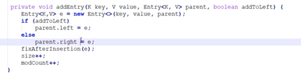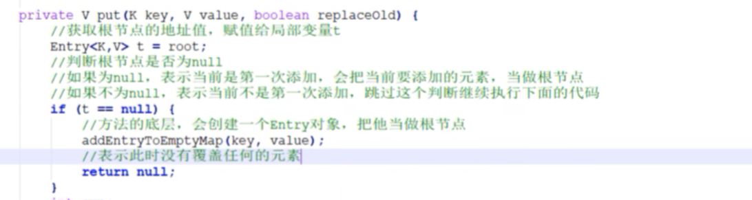 ② 对t的是否空的if判断语句,其中addEntryToEmptyMap(key,value)方法是将其首次添加的元素设置为根节点。return null 之后下面的代码就不走了。