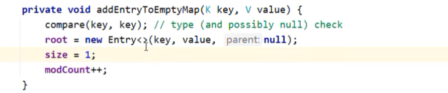创建了一个Entry的对象(Entry是TreeMap的一个内部类,创建类的对象),并且把这个地址值赋值给了root根节点(parent null)。同时将size长度设置为1,表示已经添加成功集合中已经有一个元素存在。