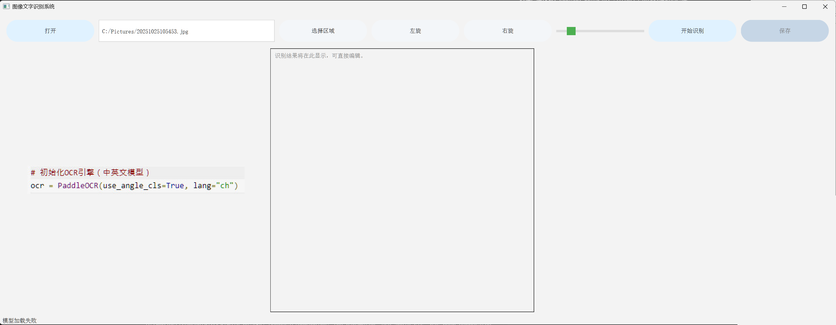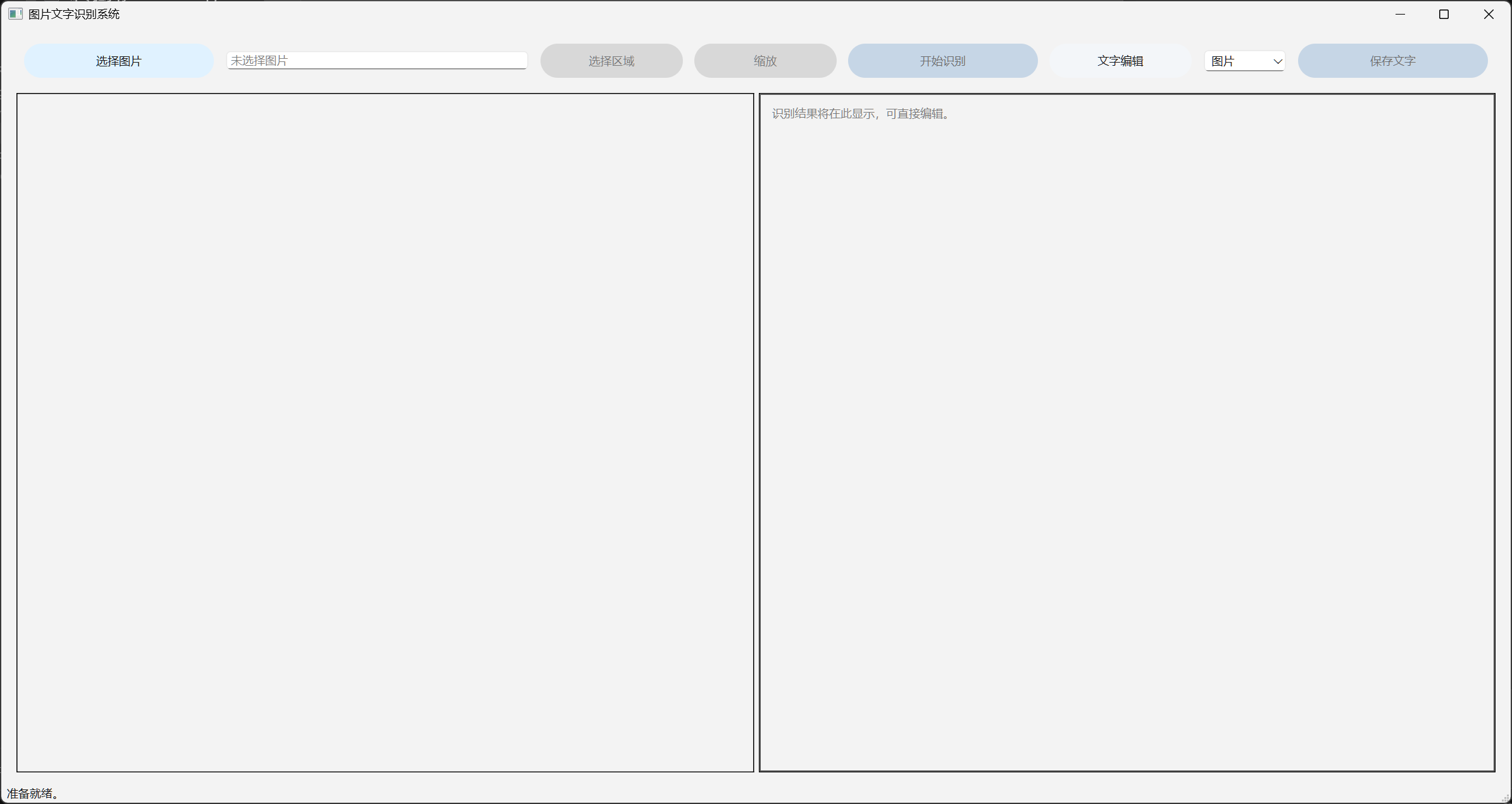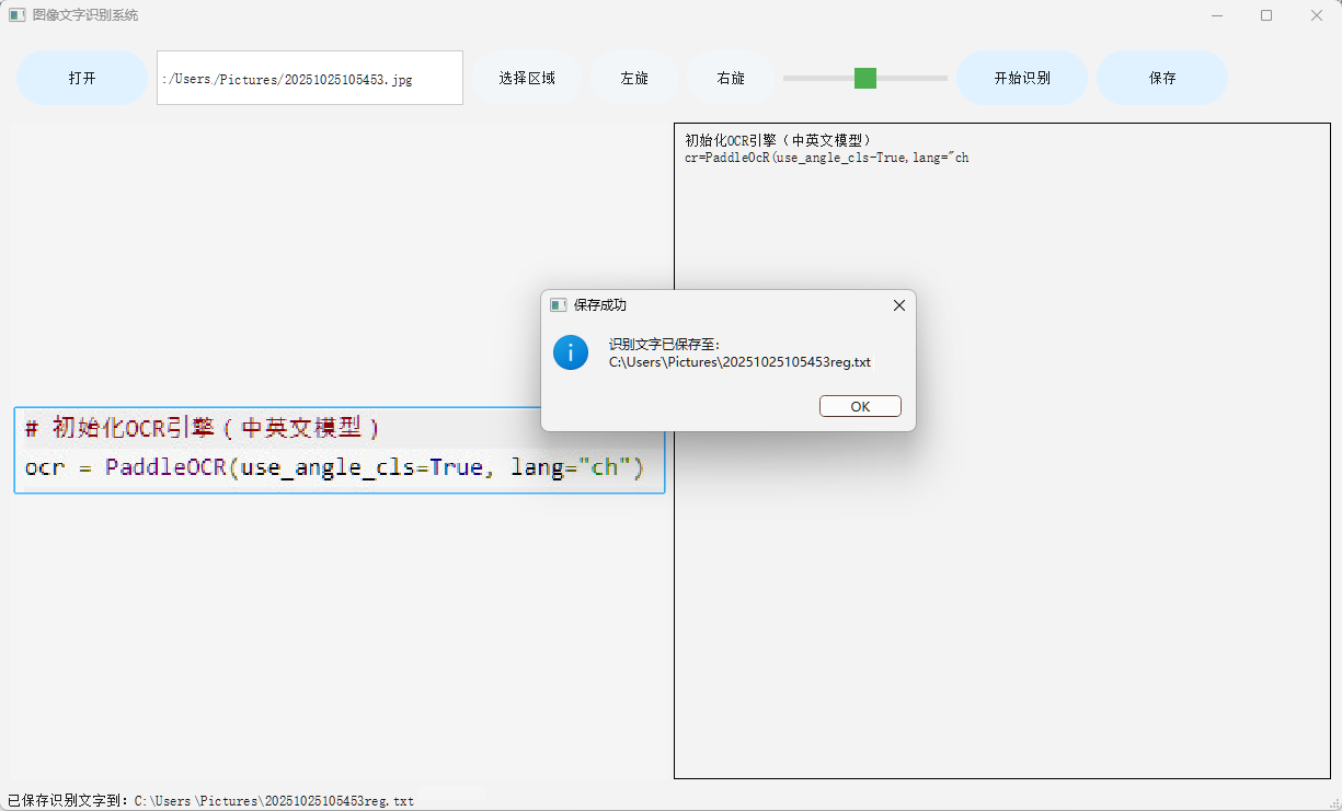 - 实现"选择图片""选择区域""缩放""开始识别""保存文字"等功能按钮及保存为同目录 *-reg.txt,同时保留"文字编辑""保存格式"预留行为。
