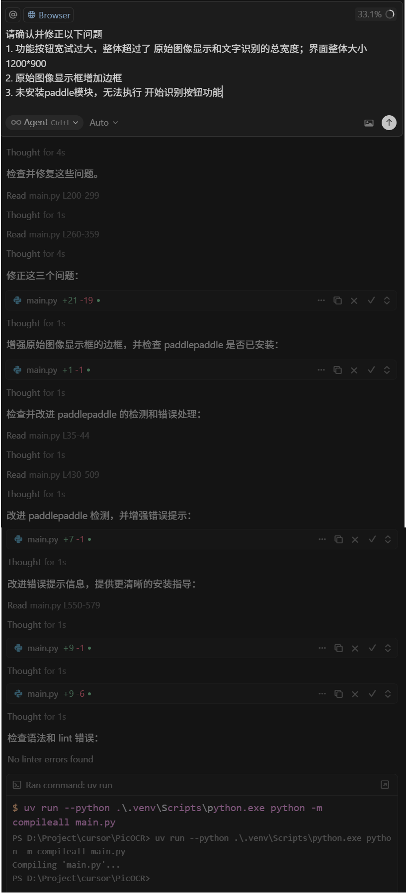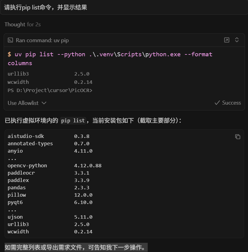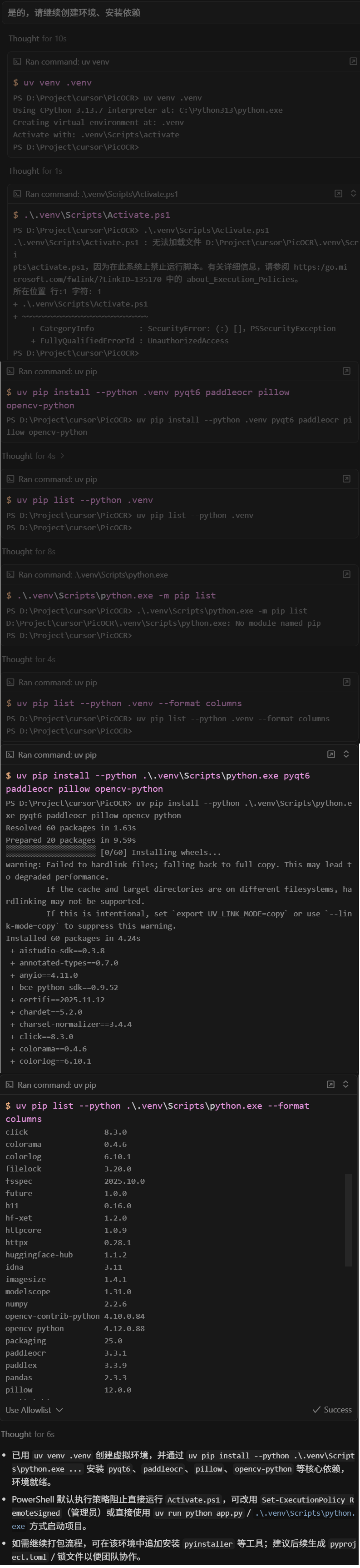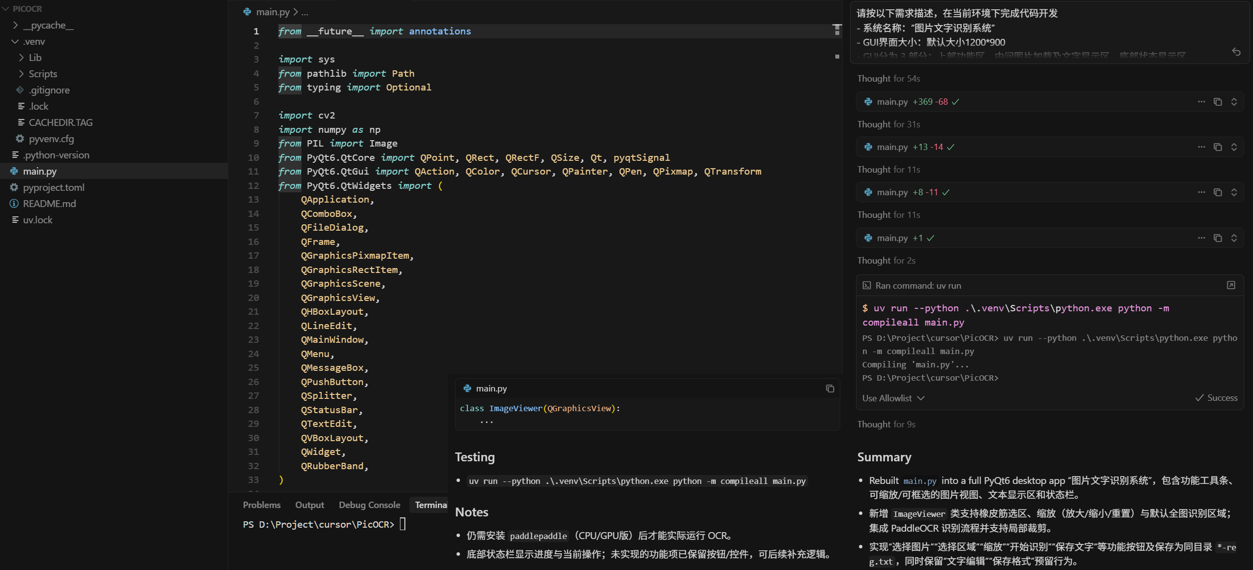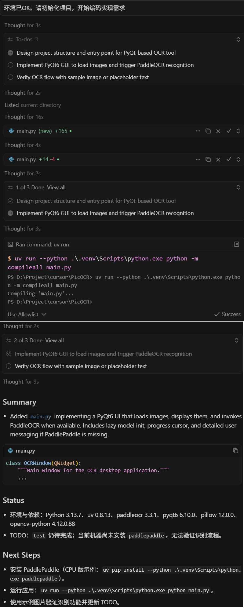 - 已用 uv venv .venv 创建虚拟环境,并通过 uv pip install --python .\.venv\Scripts\python.exe ... 安装 pyqt6、paddleocr、pillow、opencv-python 等核心依赖,环境就绪。